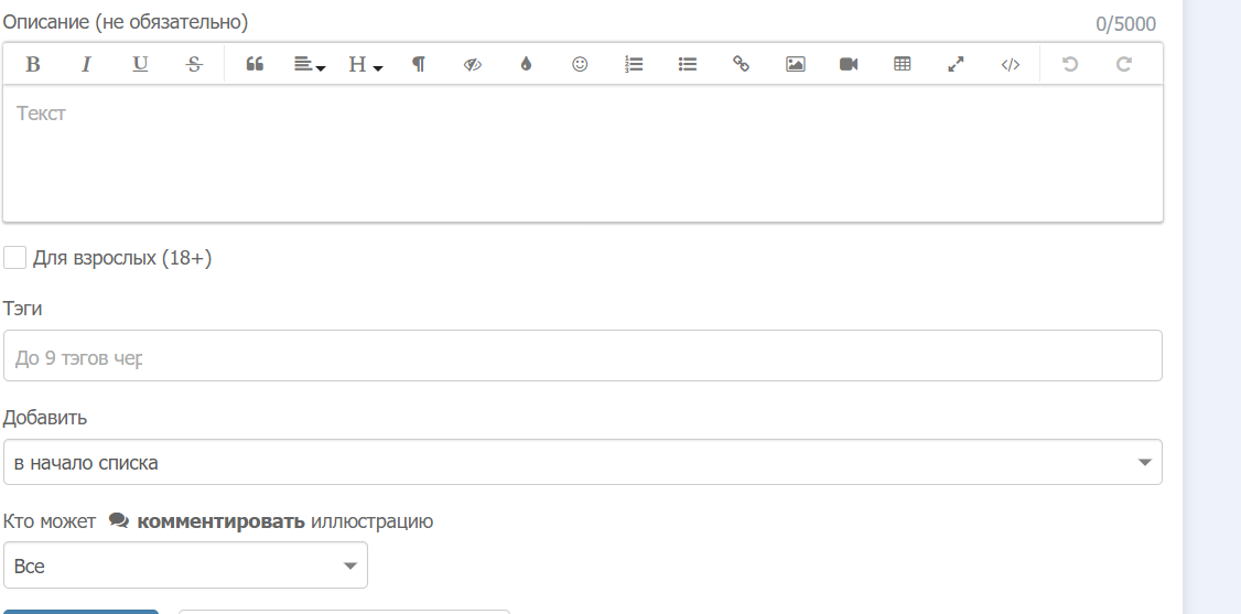 1. Описание - для описание ТЗ, вашего описание иллюстрации или иных моментов, которые посчитаете нужными.2. Для взрослых - если имеются жестокие сцены или сцены сексуального характера.3. Теги - используются для обозначения основных моментов в иллюстрации (К примеру, "драконы", "животные", "природа" или иное).4. В начало списка или конец списка - у каждого художника есть своя лента иллюстраций. И вы определяете, куда будет добавлена новая иллюстрация: в верх или низ списка.