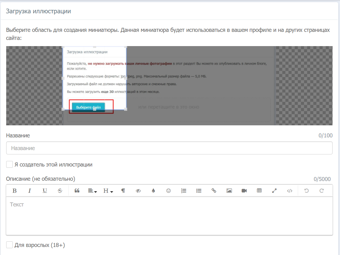 На АТ существует ограничение как по весу (для иллюстраций 5 мб, для вставки в блог 3 мб, для обложек 500кб), так и по количеству в месяц | 1. Определите положение квадрата. Именно это увидят изначально пользователи.2. Название - что прочитают пользователи3. Применяйте галочку напротив, только если вы человек создавший изображение, чтобы не создавать проблем себе и порталу. Поскольку иначе это нарушение авторских прав создателя. |