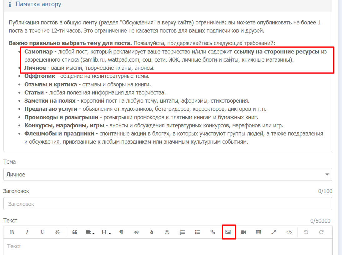 Детально о подобном писал Пётр Жгулёв ранее: https://author.today/post/143452В случае, если вы планируете рассылать какие-то изображение массово, то формируется пост, который остается в черновиках.Внутри него вставляются все нужные изображения. После чего копируется ссылка на конкретное изображение ![]() | После чего арт вставляется при помощи нужного значка в посте/сообщение/книге и ввода ссылки![]() |