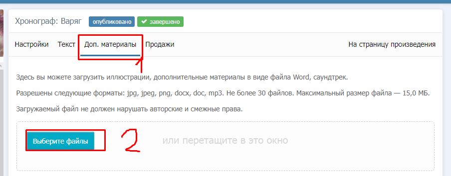 У авторов имеется возможность вставки дополнительных материалов к произведению![]() | После этого необходимо выбрать нужный файл, вставить |