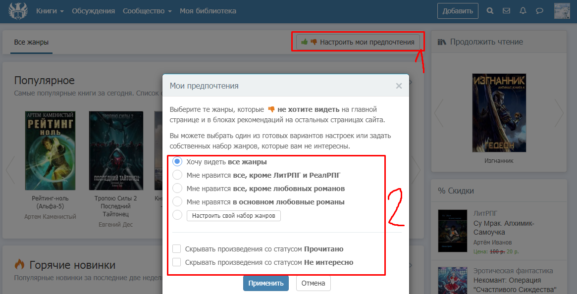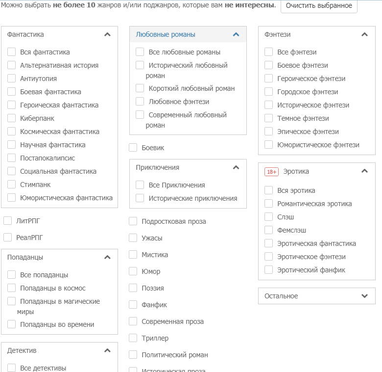 Последние два пункта зависят от вашей библиотеки. Если добавите книги в один из этих двух разделов и поставите галочки - не будете видеть книги на главной странице. | В случае, если вы хотите убрать какие-то жанры выборочно, то выбираете 10 жанров. При этом следует учитывать, что если вам не нравится какой-то крупный раздел, то следует выбрать "Вся/все ...", чтобы фильтр зачёл это как за одну галочку, а не то число жанров, от которого фактически вы отказались.![]() |