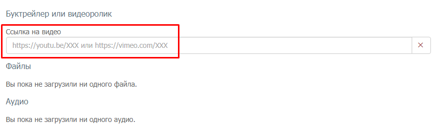 | В настоящее время возможна загрузка видео лишь в виде буктрейлеров в дополнительные материалы к книгам и видео в посты. | ![]() |