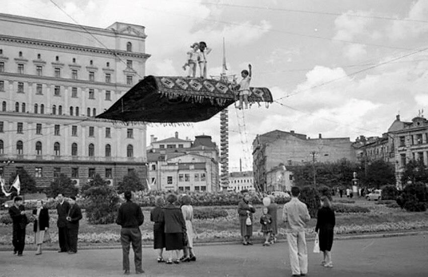 1957 год, Москва, Лубянская площадь. Ковёр–самолёт на Лубянке. Был установлен к VI Всемирному фестивалю молодёжи и студентов, а через год на этом месте будет установлен памятник Дзержинскому.