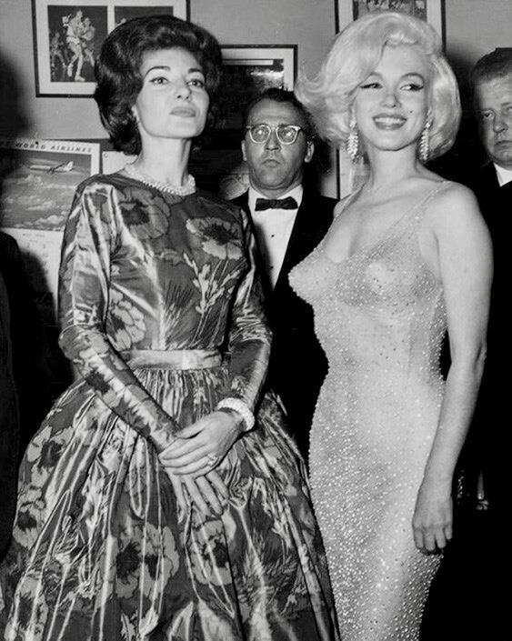 1962 год, США. Мария Каллас и Мэрилин Монро в своём теперь уже культовом платье на гала-концерте в честь дня рождения Джона Кеннеди.