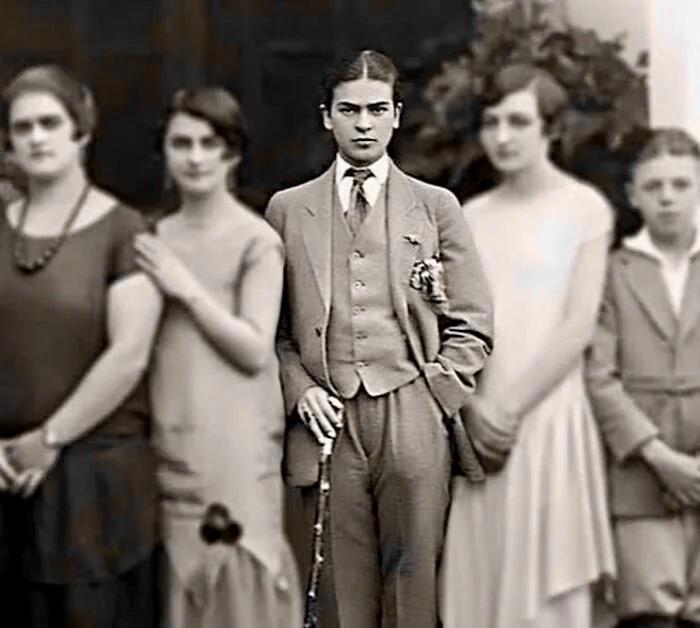 1924 год, Мексика. Фрида Кало позирует для семейного портрета в своем легендарном костюме-тройке и с тростью.