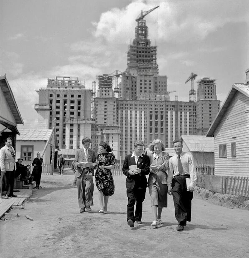 1951 год, Москва, Ленинские горы. Строительство главного здания МГУ. Комсомольцы-облицовщики – ученики школы рабочей молодежи. Слева с фотоаппаратом – корреспондент Яков Халип. Фотография Евгения Умнова, Союз фотохудожников России.