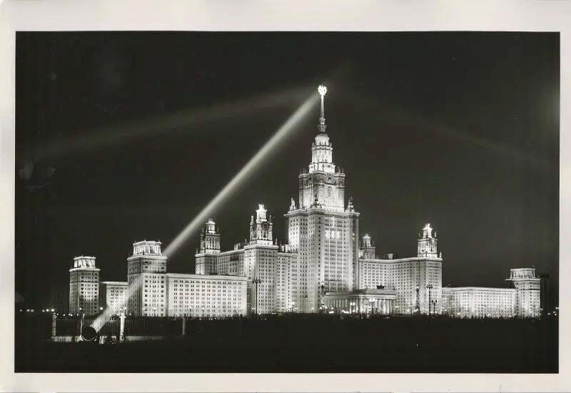 1951 год, Москва. МГУ на Ленинских горах в свете прожекторов. Фотография Евгения Умнова, МАММ/МДФ.