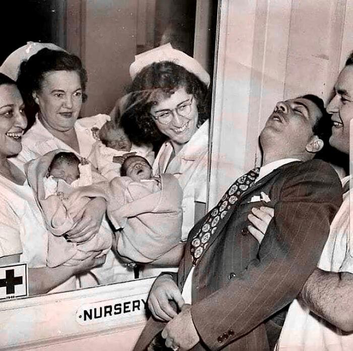 1946 год, Нью-Йорк. Медсестры показывают новорожденных тройняшек их очень удивленному отцу. Фото Keystone-France.