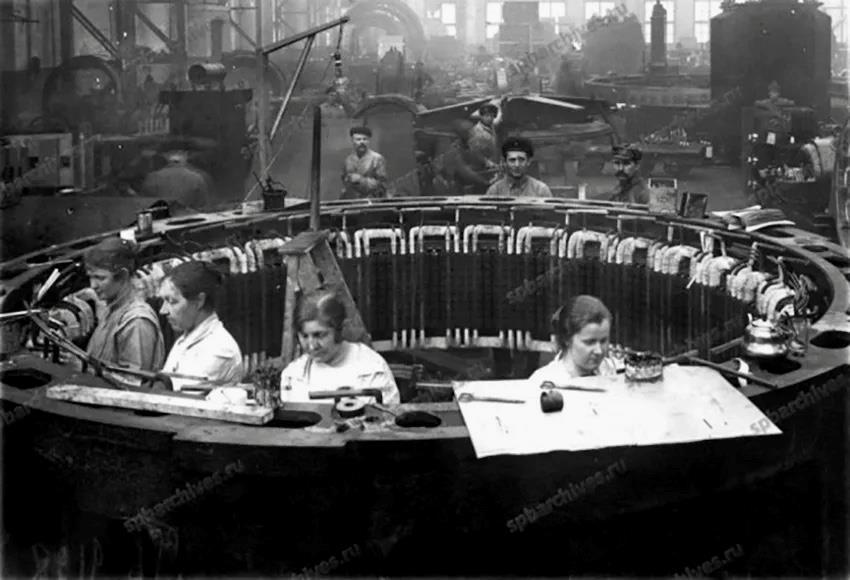 1926 год, Ленинград. Сборка электродвигателя в одном из цехов завода «Электросила». Фотография С.А.Магазинера.