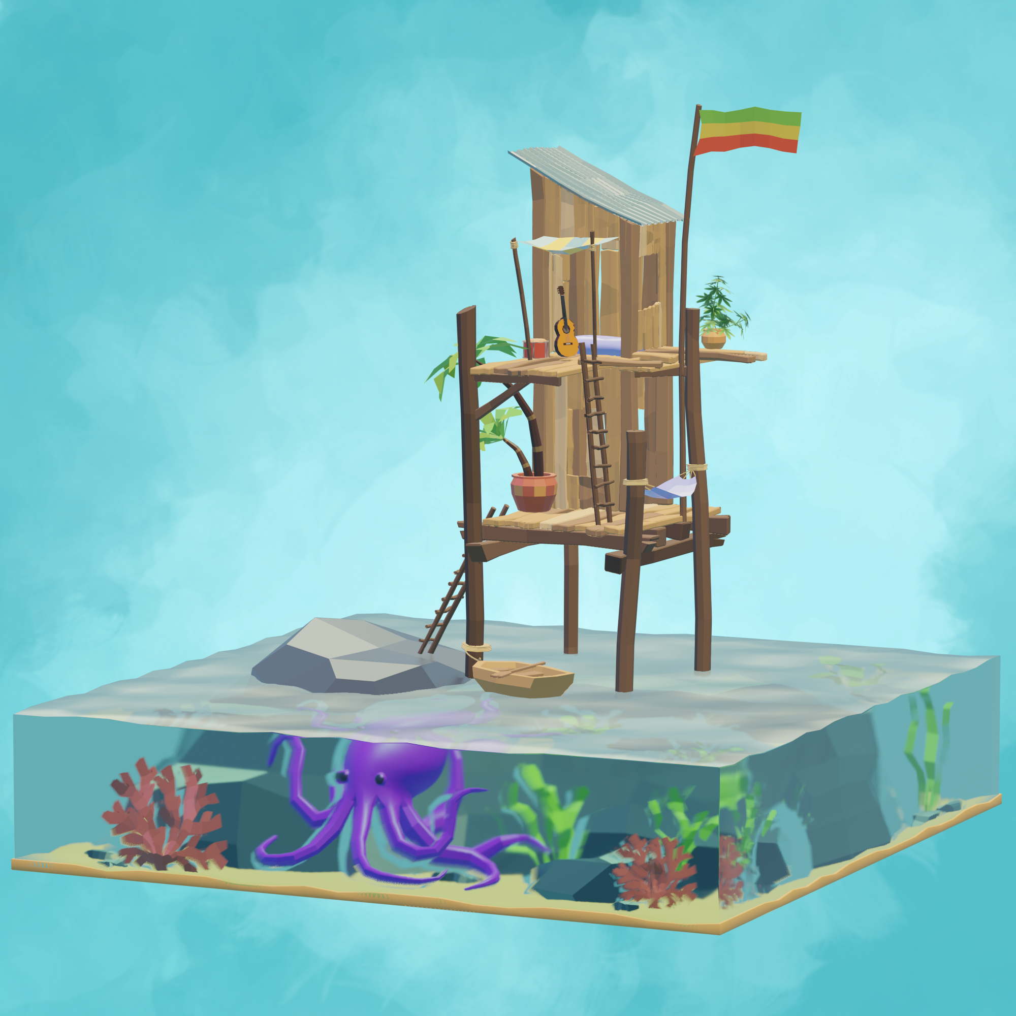 Процесс одиночного перетаскивания досок был долгим и нудным. В итоге воображение разыгралось так, что нейтральная хижина из урока, который я изначально хотела пошагово воспроизвести, стала домиком растамана. Гитара, конопля, фиолетовый осьминог - плоды исключительно моей больной фантазии и расшатанных нервов, которые говорят, что солнце и рэгги определённо лучше того, что творится вокруг...