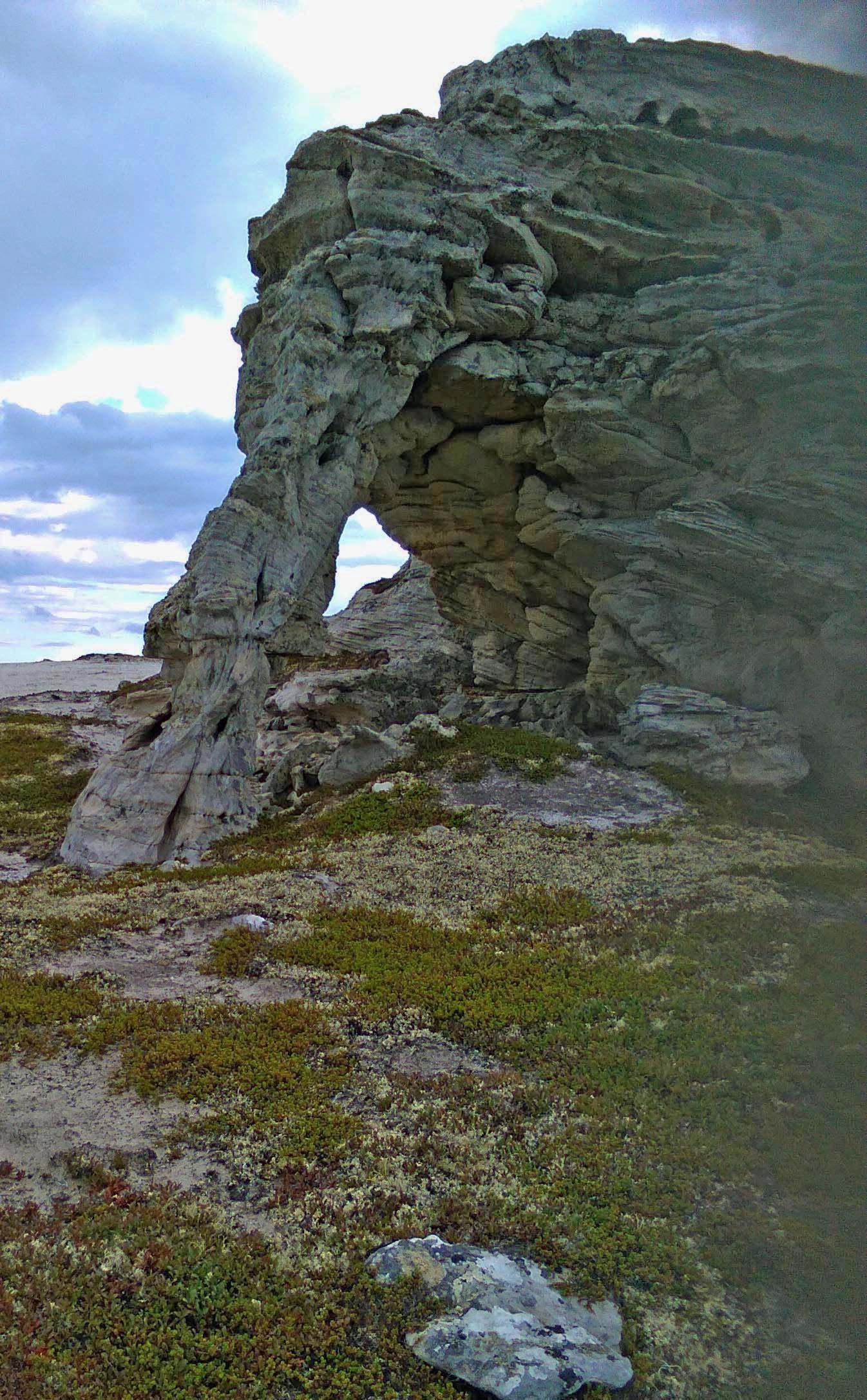На высоком берегу (35 м над урезом воды) красивейшей реки с поразительной чистоты водой, обрывающемся в ступенчатый каньон – словно неглубокая широкая чаша, покрытая тундровыми лишайниками, арктоусом и вороникой. Со стороны устья Кумушки красуется группа останцов из кварцевого песчаника. Мы назвали это место Мамонтёнки, по краям выветренных скал обнаружено по каменному мамонтёнку(возраст определили по росту) – почти зеркальное отражение друг друга.