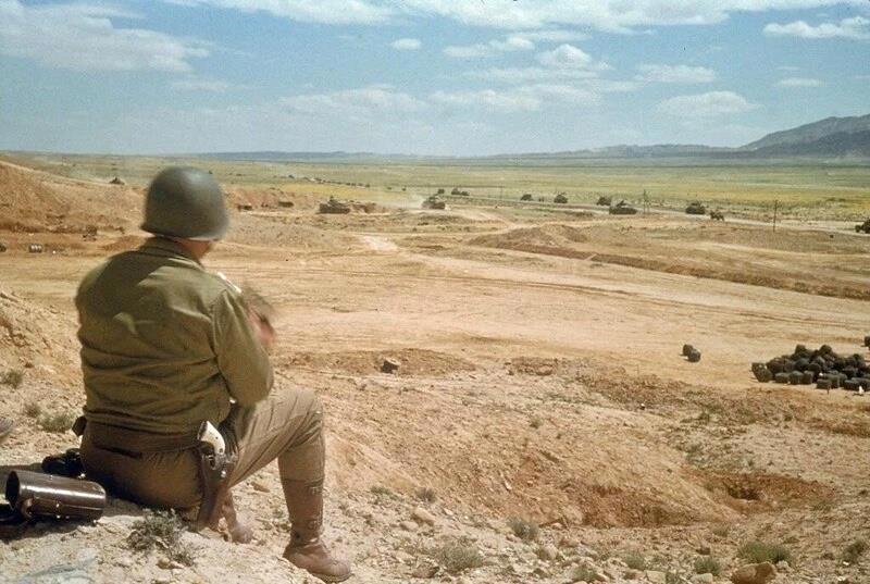 Май 1943 года, Тунис. Генерал Джордж С. Паттон наблюдает, как его войска продвигаются через долину Эль-Геттар.