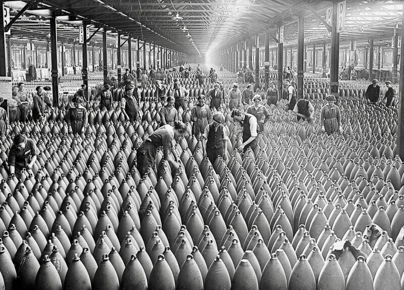 1917 год, Великобритания, Нотингемшир, Чилуэлл. Ряды артиллерийских снарядов на Национальной артиллерийской фабрике во время Первой мировой войны.