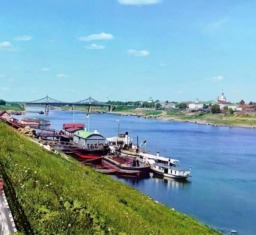 1910 год. Вид г. Твери с мостом через Волгу и пароходными пристанями. Фотография С.М.Прокудина-Горского.