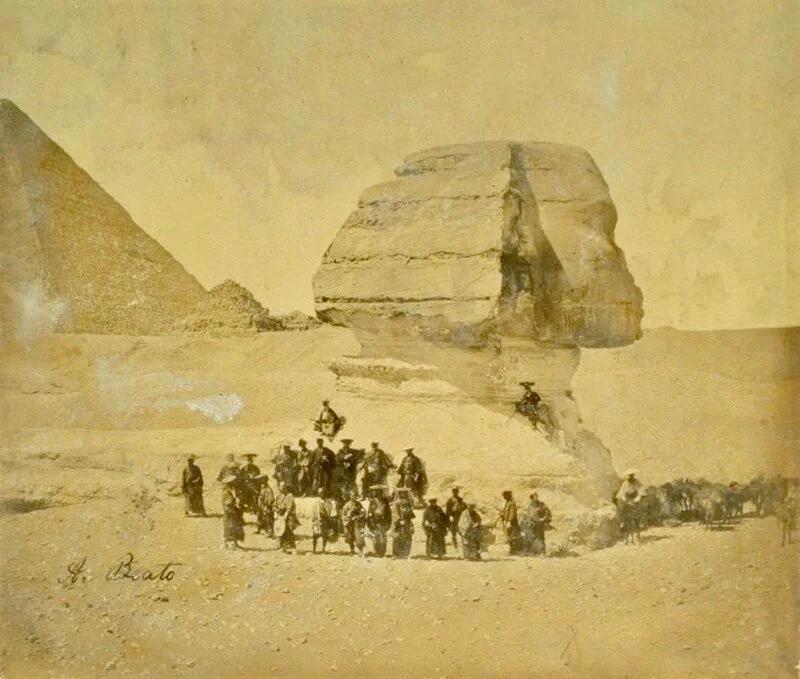 1864 год. Группа самураев, путешествующая по Египту, фотографируется на фоне Сфинкса.
