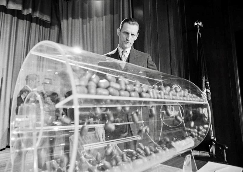 1969 год, США, Вашнгтон. Лотерея Призывной службы, определяющая, кто будет призван во Вьетнам первым. В каждой капсуле указан день года, определяющий порядок призывников по дню рождения.