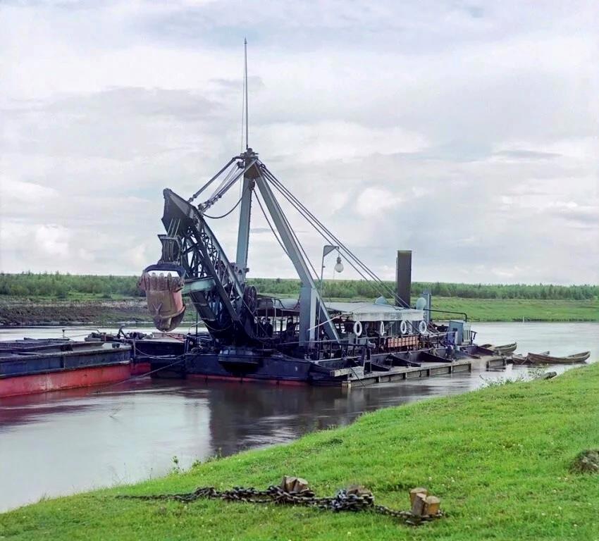 1909 год, р.Шексна. Камнечерпательная машина одночерпакового типа Свирская 2-ая. Фотография С.М.Прокудина-Горского.