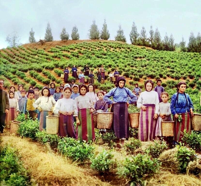 1912 год, Аджария, Чаква (или Чакви). Группа рабочих на сборе чая. Гречанки. Фотография С.М.Прокудиа-Горского.
