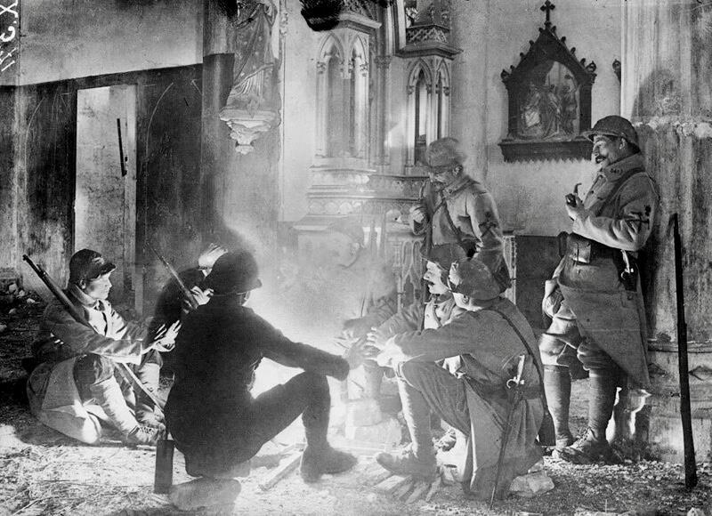 1916 год, Франция. Французские солдаты разговаривают у костра внутри поврежденной церкви недалеко от Сен-Миеля.