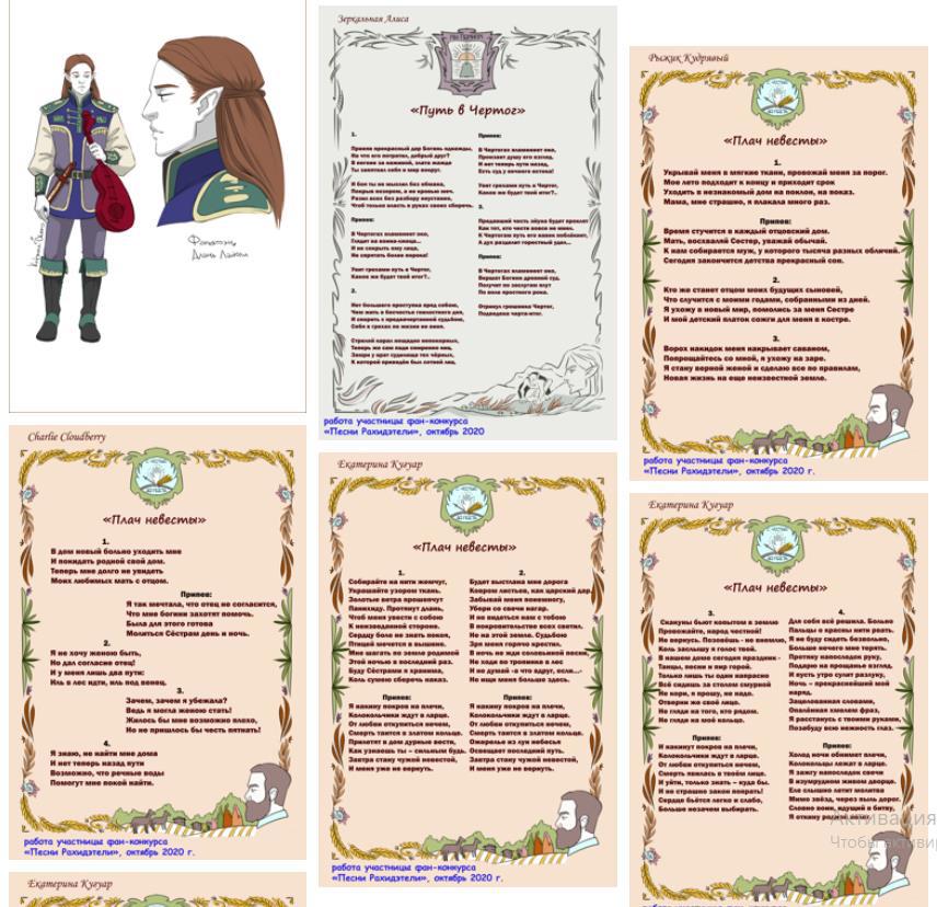 4. Песни, написанные участниками конкурса "Песни Рахидэтели". Стояла задача имеяя мельком упомянутое в книге название и описание, сочинить песню, которая по менталитету соответствовала бы народу, "написавшему" ее. Бланки, на которых размещены песни, делались на заказ и содержат символы и значимые элементы для каждого народа - для полного погружения в историю.