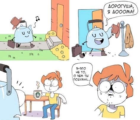 - А как еще назвать Кофе? Оно. А потом вот! - Чайник показывает на стол. - А потом вот! Дети от таких каким-то чудом получаются!