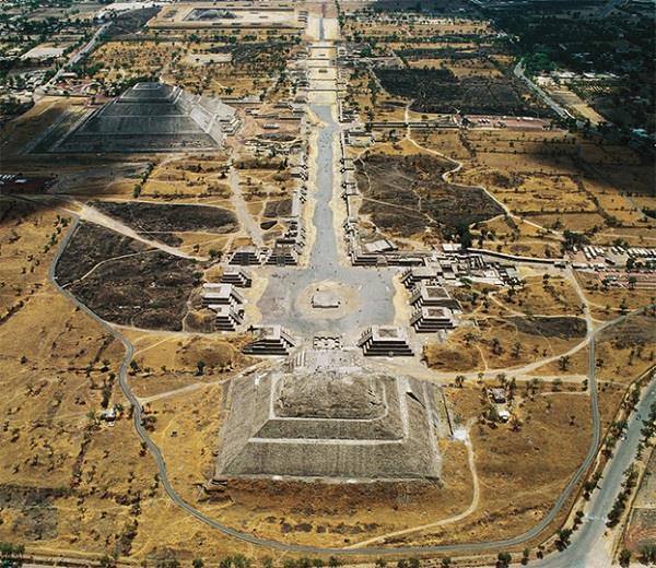 Центр древнего города составляет архитектурный комплекс, носящий очевидно религиозный характер. Удивляет то, что при строительстве города его план был заранее и очень тщательно продуман. Город разделяет на две части длинная прямая дорога, называемая сейчас Дорогой Мертвых.