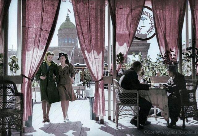 Май 1941 года, Ленинград, предположительно угол Проспекта 25 Октября (Невский проспект) и ул.Софьи Перовской (Малая конюшенная). Кафе-кондитерская, возможно, летняя веранда. Споры по поводу реальности этого фото были ещё в 90-е, а, возможно, и ранее в СССР. Авторами указывают Э.Хайкина и М.Редькина.
