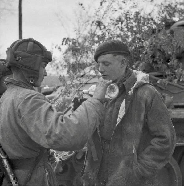 Май 1945 года, Германия. Советский танкист наливает водки британскому саперу. Возможно, что это сапер Корпуса Королевских инженеров Гриффитс, 6-я ВДД.