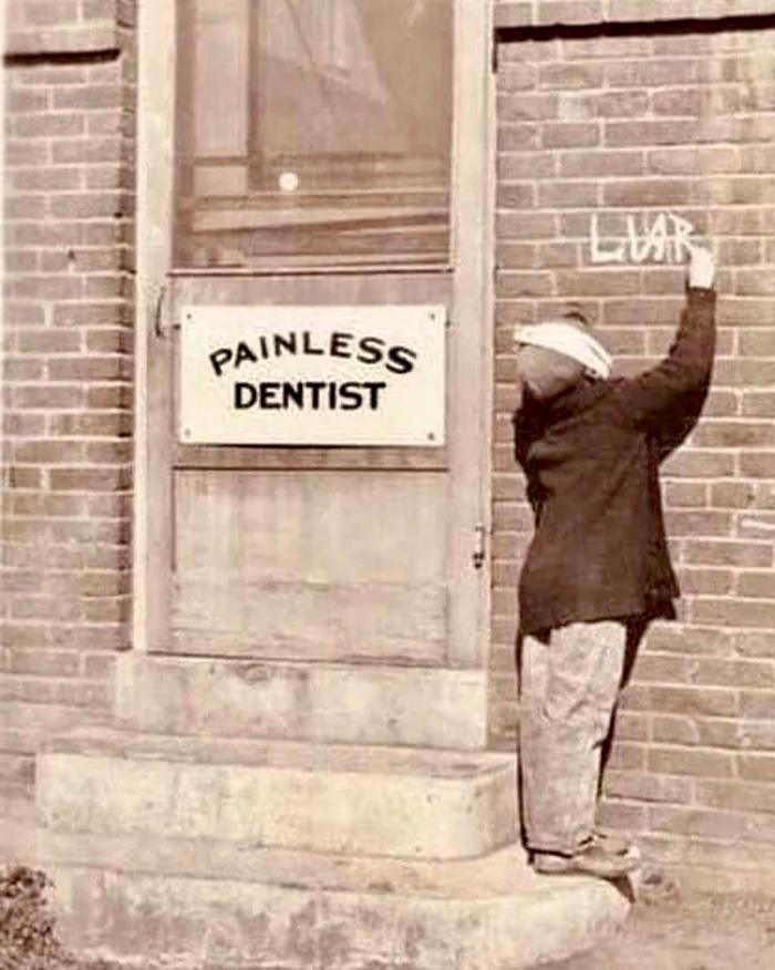 1920 год, США (?). Разочарованный юный пациент пишет «Обманщик» рядом с табличкой «Стоматолог без боли».