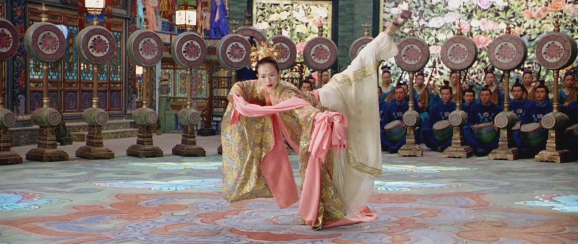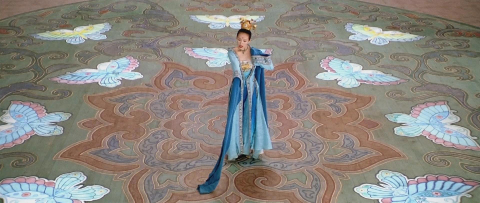 Чжан Цзыи в образе коварной красавицы Мэй исполняет танец в костюме с "водяными" рукавами ("Дом летающих кинжалов").