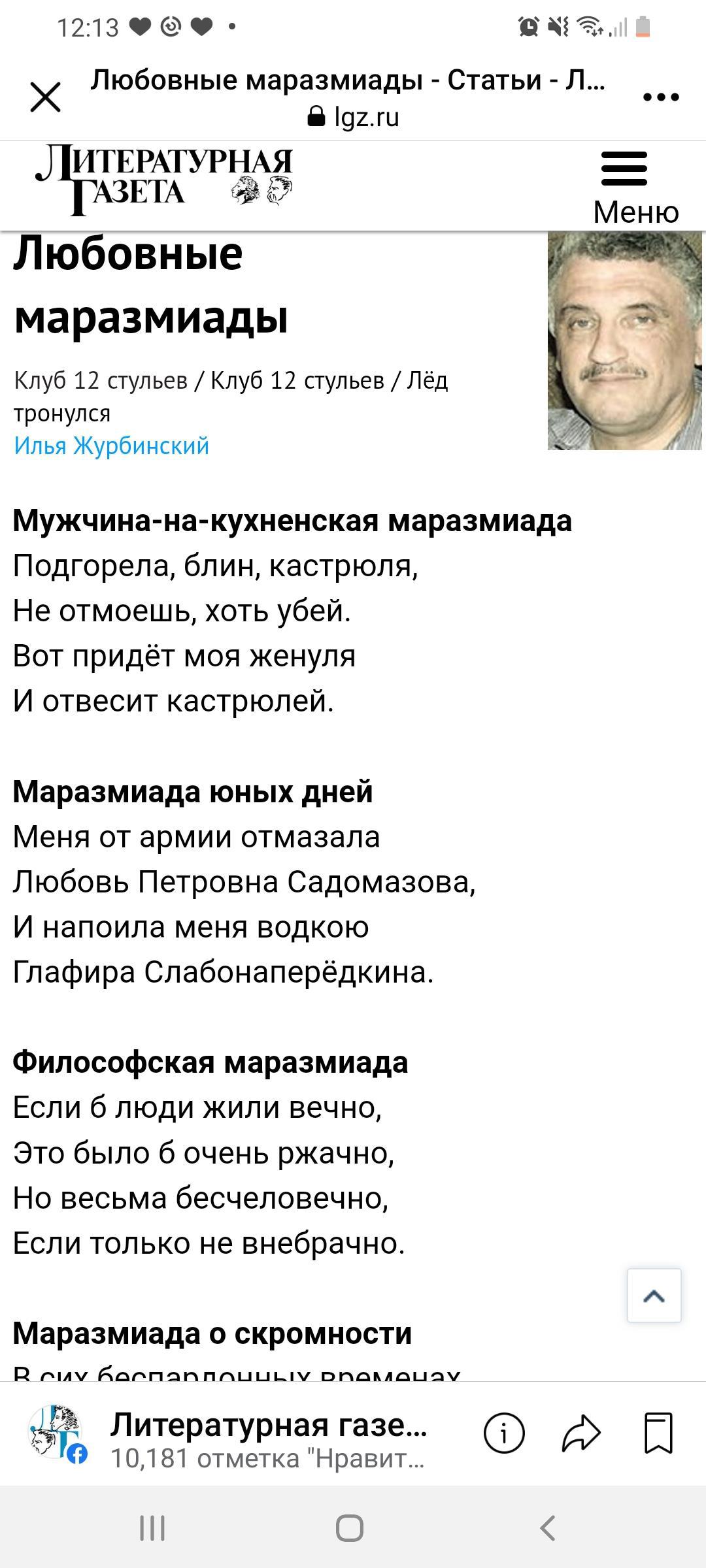 Автор: Елена ГрабовецкаяСегодня почему-то печатают в когда-то всеми любимой, самой передовой Литературной газете вот такие шедевры, Не верите? Ссылку даю https://lgz.ru/article/-10-6824-09-03-2022/lyubovnye-marazmiady-10-2022/?club12st=yes