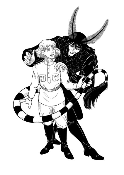 Тем временем на голове навца поднялись две слипшиеся пряди, распушились по всей длине двусторонними гребнями выростов, будто перья, изогнулись и завились по-козлиному. Ренфильд со своим носом-клювом окончательно стал похож на рогатого чёрта.
