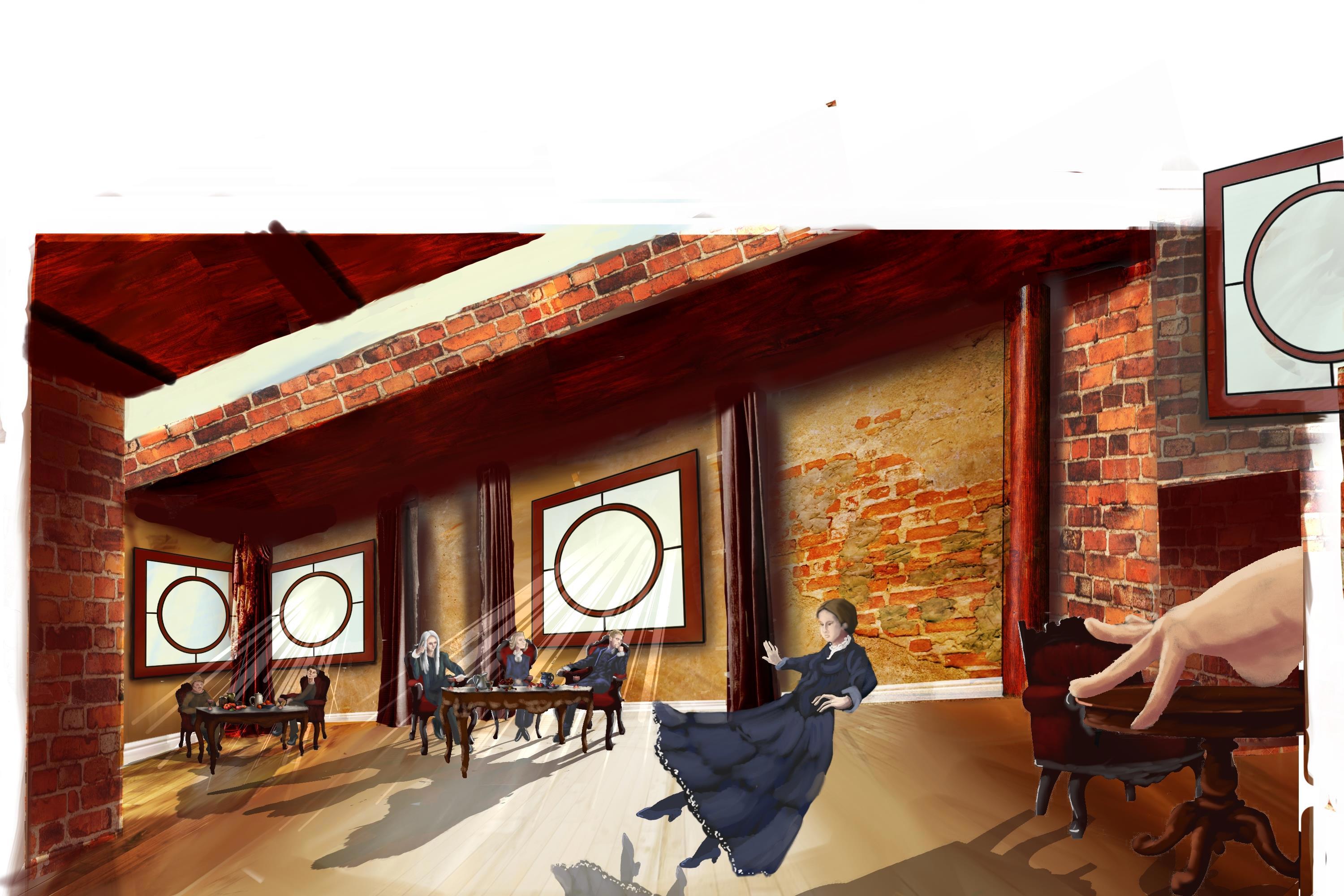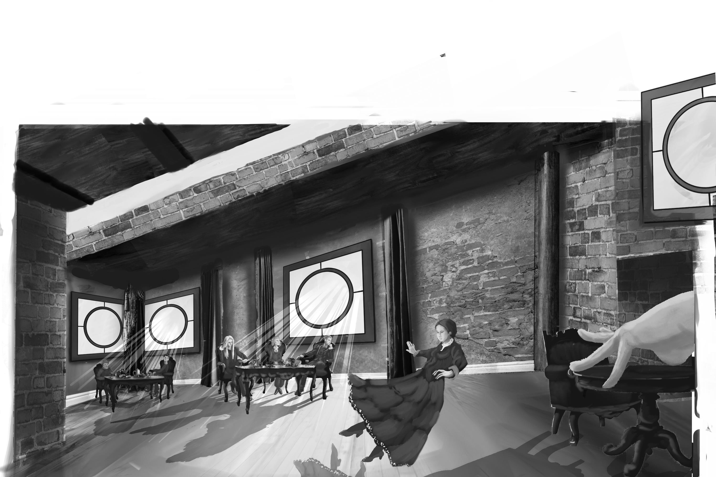 Уже на первом этапе я начала искать рефы. Интерьер таверны слямзен с какой-то фотки, выпавшей по запросу victorian tavern. Я как бы знала, что в конце у меня будет чб картинка, но сразу рисовать в чб мне было сложно. Поэтому я начала в цвете. Пользуясь уроками Харди Фаулера, набросала подложек с фактурой дерева и кирпича в разной освещенности, со световыми пятнами, там, куда должны были падать лучи из окон, размыла это все в ноль и расставила силуэтами мебель.
