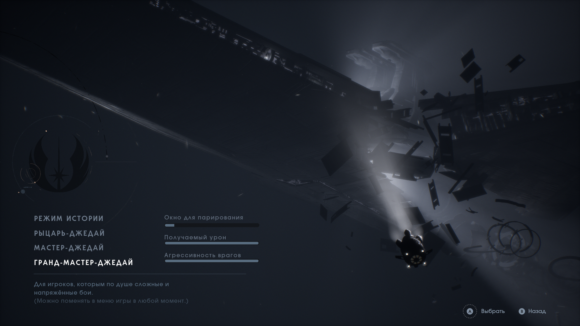 Сложность поставила максимальную, но после прохождения первой планеты пришлось понизить до Мастера-Джедай. Кривые хит-боксы - зло!