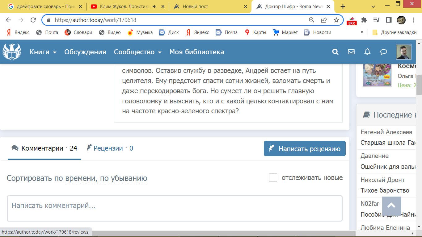 Автор: Андрей ВдовинНедавно я написал и опубликовал рецензию на один роман. Но почему-то на странице с книгой возле кнопочки "Рецензии" по-прежнему стоит нолик - как будто там до сих пор вообще нет ни одной рецензии. В то же время ежели ткнуть эту кнопочку и зайти - то рецензия таки предстанет перед глазами во всей красе.