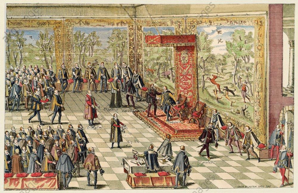 Франц Хогенберг. Отречение Карла V в 1555 году. Раскрашенная гравюра 1583 года.