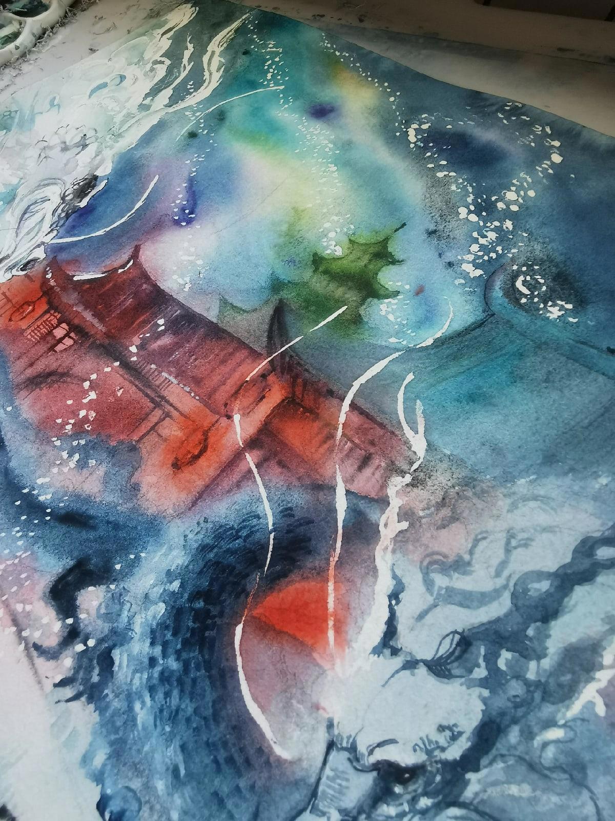 Потом облила бумагу в душе с двух сторон. Подмалевок всегда делаю по-мокрому.Это самая приятная часть работы с акварелью . Жду , когда бумага наберет в себя воду и начинаю с самых светлых участков.