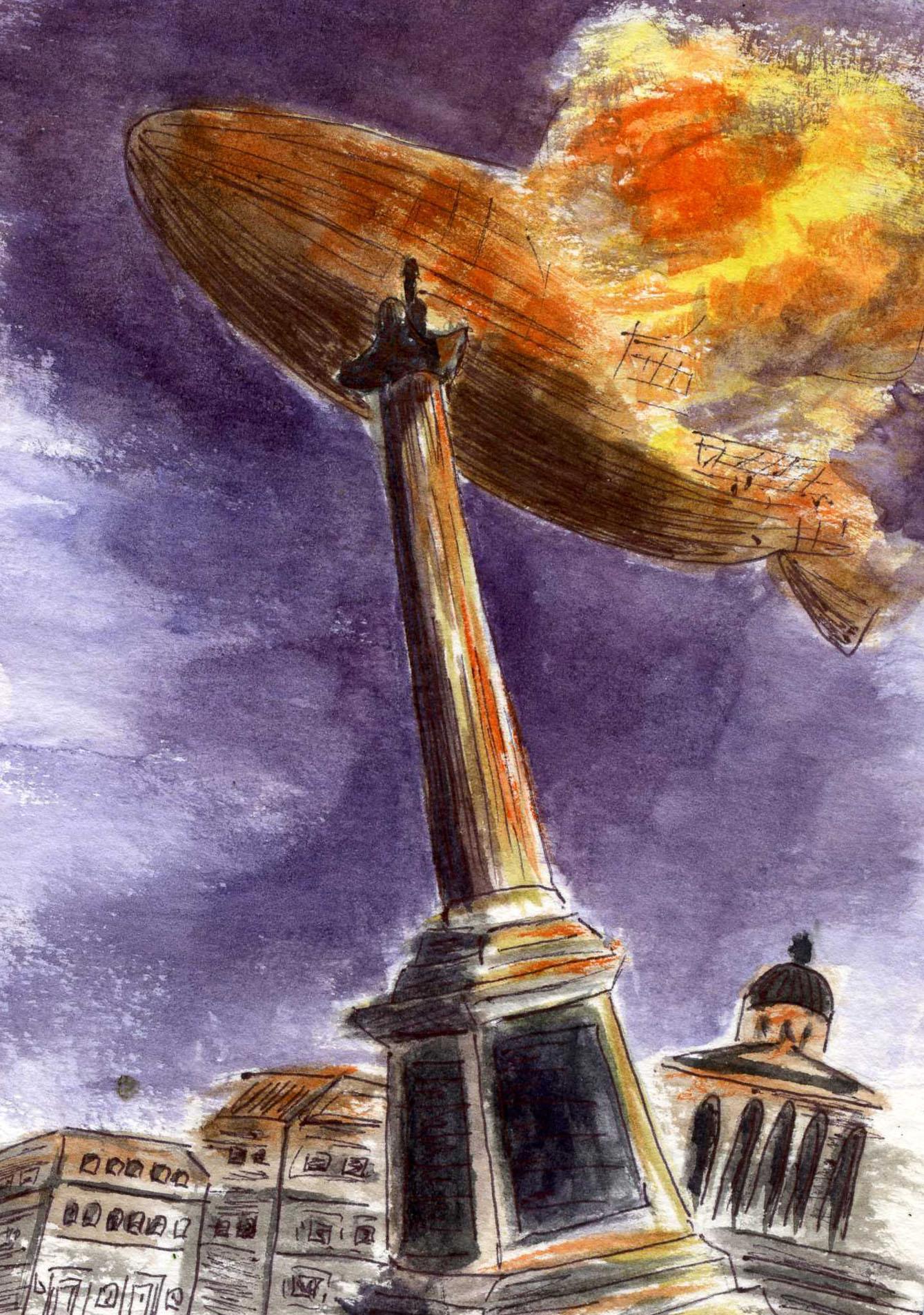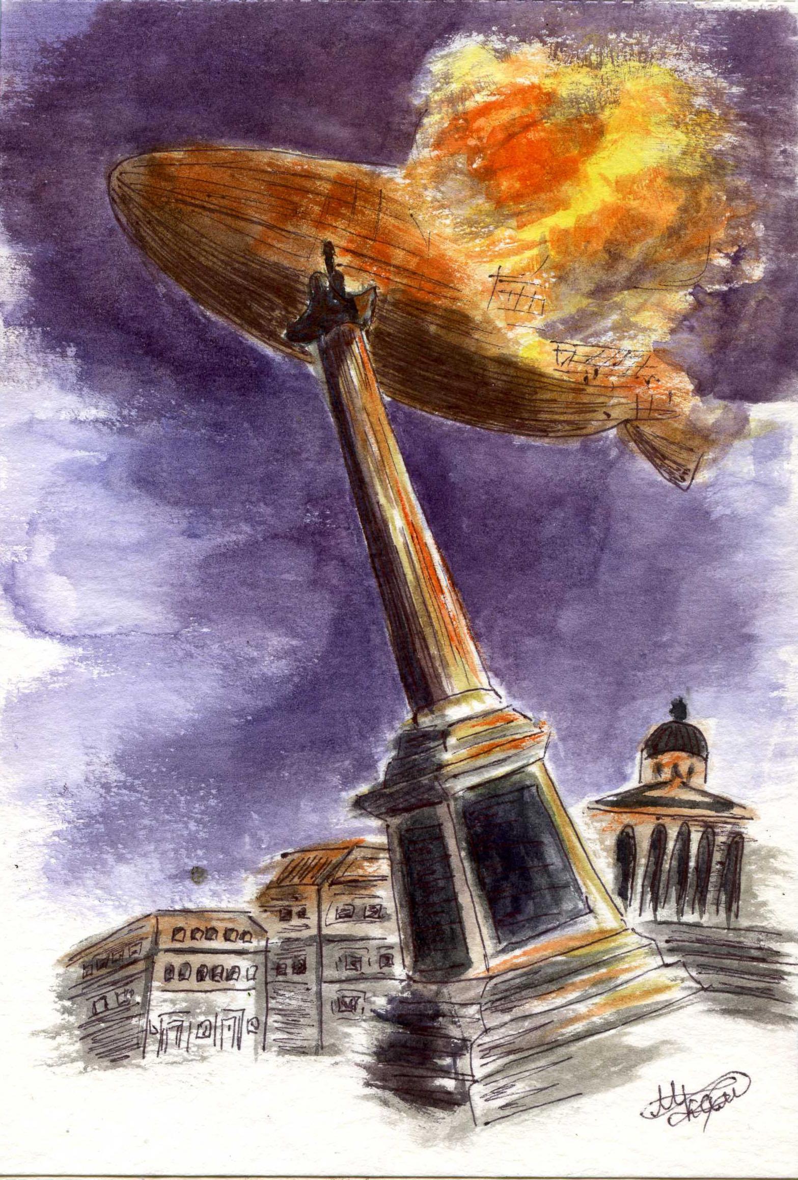 Автор: Мария КамардинаПродолжаю делать быстрые картинки по роману «Леди и вор» — горящий дирижабль над Трафальгарской площадью из третьей главы и котик из шестой