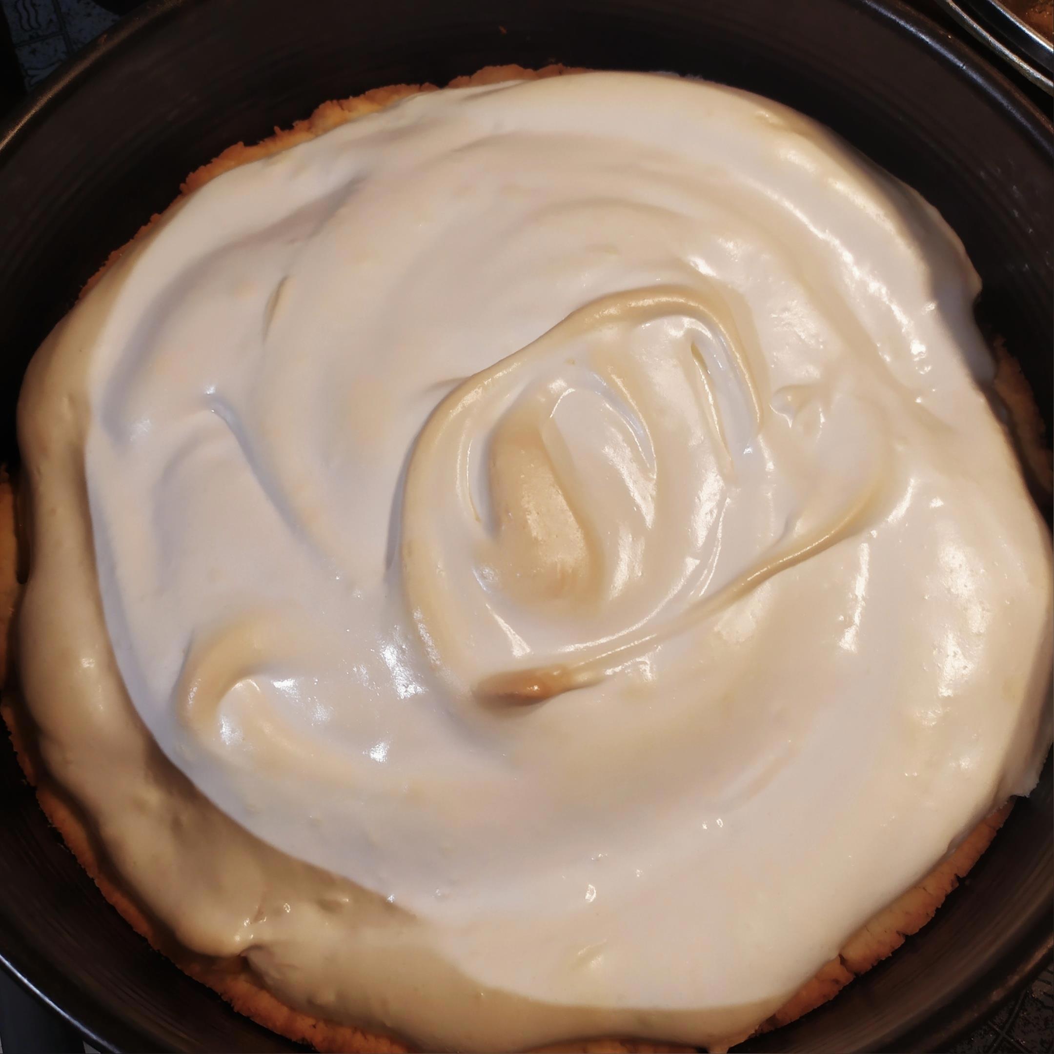 Взбиваешь 3 белка с 1/2 стакана сахара и щепоткой соли или лимонной кислоты (чтобы получились "устойчивые пики"). Выкладываешь белки на начинку/сметану и еще в духовку минут на 5-10, чтобы схватилось.