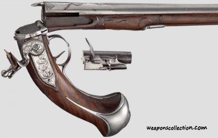 Что б получить нарезной ствол в общем то не так и сложно. Первое нарезное оружие появилось в конце 15 века в Германии и с небольшой помощи автора ГГ всегда сможет им обзавестись. Однако те образцы до середины 19 века заряжались через дула методом забивания пули в ствол, что б свинец зашел в нарезы, что достаточно трудоемко и время затратно, что для боя имеет значение. В этом случае наш современник конечно задумается о казнозарядном способе и будет прав. Подобное оружие появилось в конце 17 — начале 18 века. Одним из конструктивных решений стало использование в оружии сменных зарядных камер. Пуля размещенная с казенной части не деформируется в процессе заряжания, даже несмотря на размеры почти равные диаметру канала ствола. Так же можно и поднять скорострельность при наличие нескольких сменных зарядных камер.