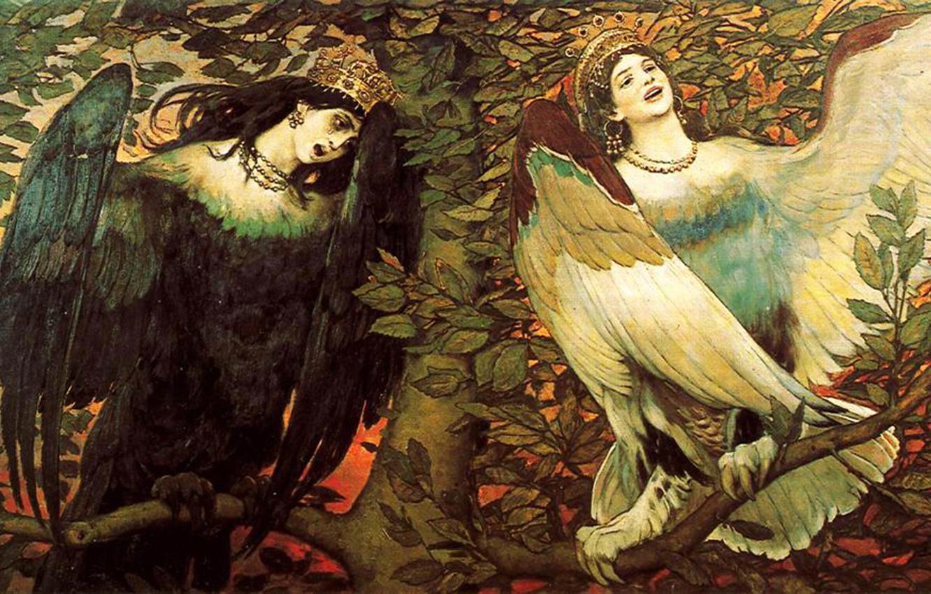И мне кажется, что слева Мир, а справа Война, хотя я хотела рисовать ночь и что то типа птиц-дев Солнечного сада: Гамаюн, Алконост и Сирин, такие были ассоциации с картиной Васнецова «Сирин и Алконост. Сказочные птицы, песни радости и печали» (1896 год)