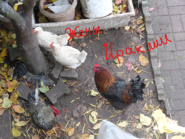 Вот у нас три петуха: Ираклий, Климентий и Дормидонт. Все красавцы писанные. И у каждого свой гарем. Падишахи, епта. Ходят и водят своих баб, чтобы всегда под рукой, если чо приспичит. А чо им приспичивает, вы и сами же знаете. Потом яйца откуда-то берутся. Ну, дети ихние.
