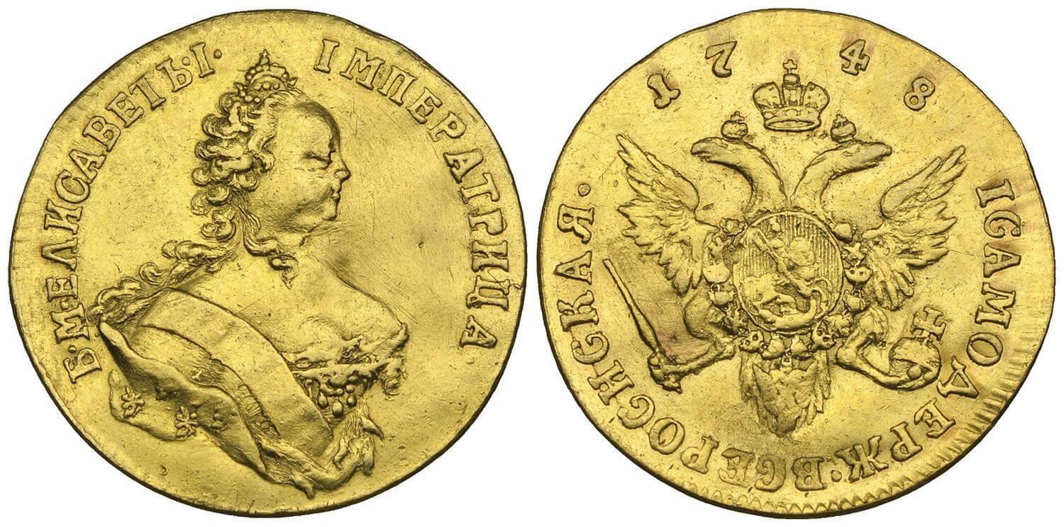 2. Золотые 20 рублей императрицы Елизаветы Петровны. В 2008 году они ушли с лондонского аукциона за 2,8 млн долларов.