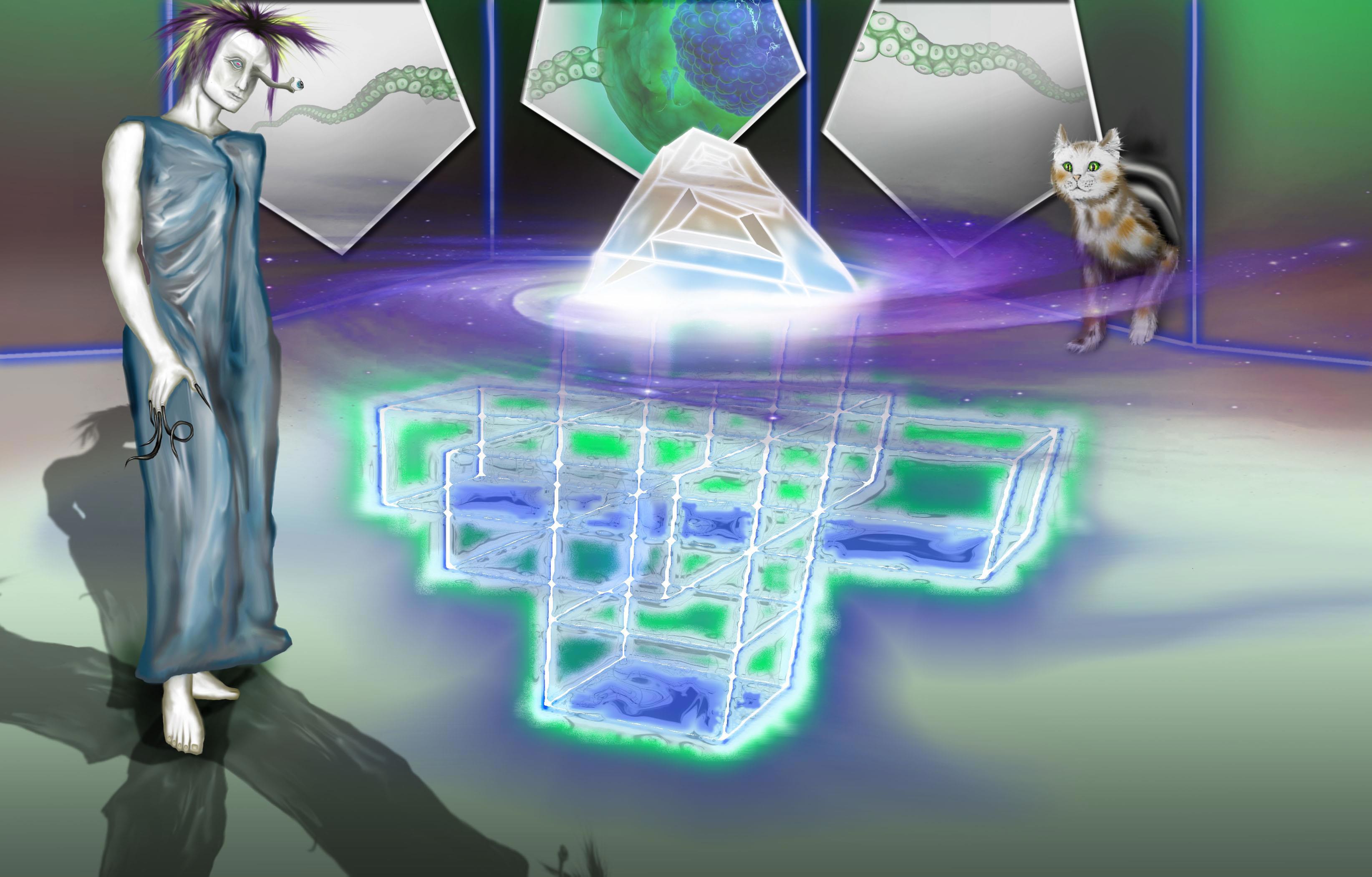 Странных персонажей у меня много, полно героев с психическими расстройствами, экзотической внешностью и всем прочим. Но звание самого странного присваиваю Дайану из "Мусорного мира". Мусорный мир - это про то, как что-то там загадили и не убрали, мусорный мир у него в голове. Целая свалка космического мусора, из которой он собрал трехмерную модель мира, похожего на наш. А сам он - существо четырехмерное (где четвертым направлением является время), и вообще живет внутри живой клетки, внутри которой изобретает вирус. Конечно, иллюстрация в полной мере не может отразить четырехмерного мира, хотя бы потому, что картинка двухмерна. Ну, еще и потому, что такое четырехмерное пространство не может представить из трехмерных существ никто. Можно только попытаться описать его, и то вряд ли описание будет точным. Проще через метрику показать... хотя нет, не проще. В общем, это такой мир, где все события уже происходят одновременно, а во времени передвигаться можно так же, как в пространстве. Вот такого персонажа я и поселила в этом спутанном в клубок странном мире. Собственно, нарисовать его было не сложно, потому что выглядеть он может так, как захочет. А еще там есть квазикотик. Этот вообще целый мир пометил и никто его даже носом в лужицу ткнуть не смог, потому что тот в субпространстве скрылся:)
