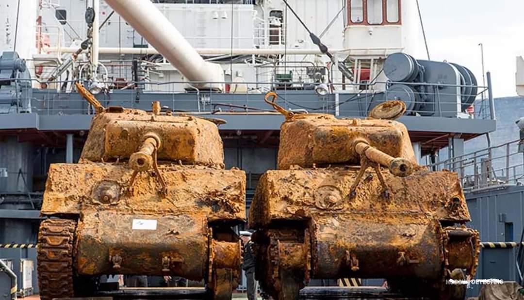 Итак, начнём. Здесь у меня два уставших "Шермана" в 2017 году. Оба не только устали, но ещё и вдоволь накупались. Начали они своё купание, а точнее - нырнули на глубину и там остались, аж в далёком марте 1945 года вместе с перевозившим их грузовым судном "Томас Дональдсон". Виновник такого длительного нырка - немецкая подводная лодка...