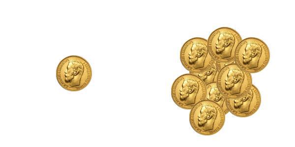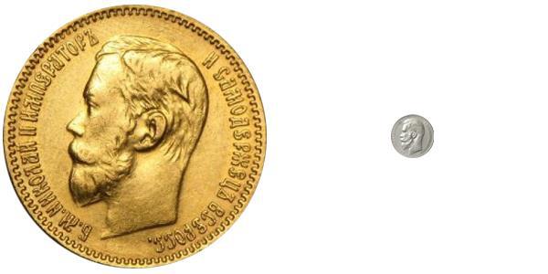Десятирублевка (конкретно эта) выпускалась уже после реформы Витте и содержит заметно меньший процент золота. Но для нас это не важно. Ее вес составляет 8,6 грамма, а диаметр равен 22,5 мм.