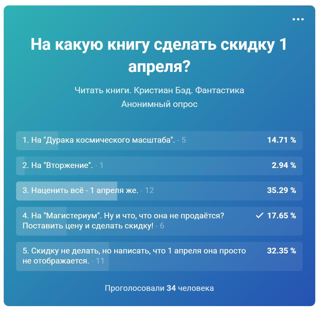 Ну и запилил опрос в вк на тему "На какую книгу сделать скидку 1 апреля?". И вот что получилось)