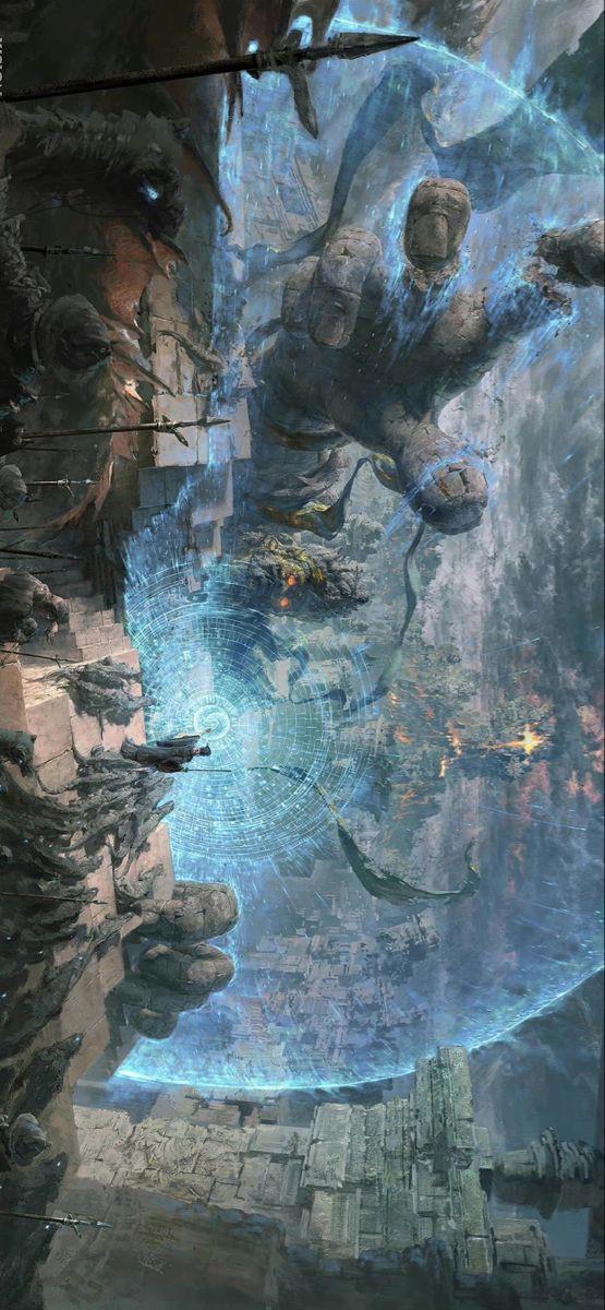В тот же момент перед исполином родилась искра яркого голубого цвета. Она в мгновение ока с ужасающим трубным звуком выросла в шар ярко-синего света, который оттолкнул гиганта на обломки горы. От невероятной мощи света, каменное тело гиганта покрылось сетью огромных трещин, а воздух наполнился звенящим громоподобным криком исполина. Он выл от боли. И в порыве ярости каменный великан метнул вперед руку, очевидно, собираясь схватить мага и раздавить, но следующая икра, родившая новый ярко-голубой шар где-то в районе плеча истукана, просто оторвала к аравийским покойникам гиганту руку.