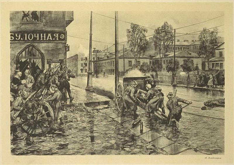 Иван Владимиров. Обстрел Владимирского военного училища, 30 октября 1917, Петроград. Бумага, уголь. Работа воспроизведена в книге В.П. Лапшина «Художественная жизнь Москвы и Петрограда в 1917 году». М., Советский художник, 1983