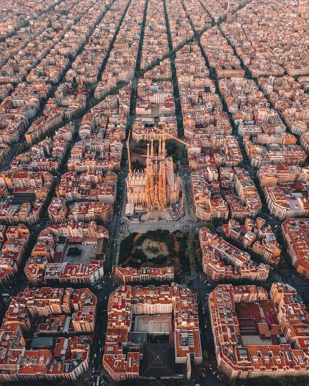 Барселона с высоты причьего полета. Кварталы по форме напоминают буквы незнакомого алфавита. В центре знаменитый собор Гауди. Святое Семейство. Мы о нем отдельно поговорим. И о Гауди тоже.